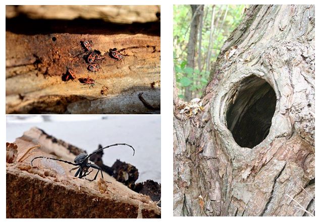 De izquierda a derecha. Arriba, un conjunto de hemípteros llamados comúnmente zapateros, aprovechan huecos de la madera como refugio. Abajo, Coleóptero xilófago – Cerambix cerdo. Derecha, hueco en tronco muerto que podrá ser utilizado por aves o pequeños mamíferos.